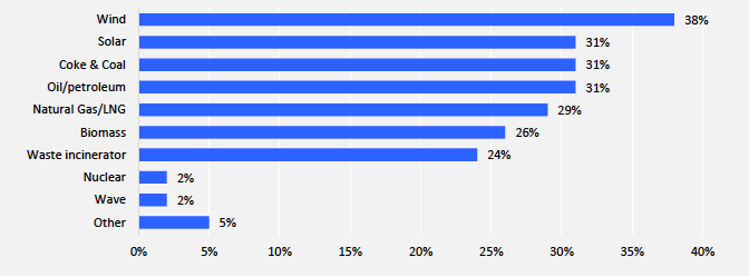 Figura 2. Generación de energía al interior de los puertos. Los valores indican la fracción de los puertos que tienen una fuente de energía específica. Fuente: DNV-GL, 2021.