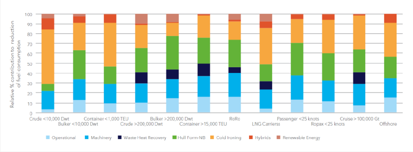 Figura 3. Impacto del cold ironing en el consumo de gasolina en barcos de acuerdo a su tamaño. Fuente: DNV-GL, 2021.