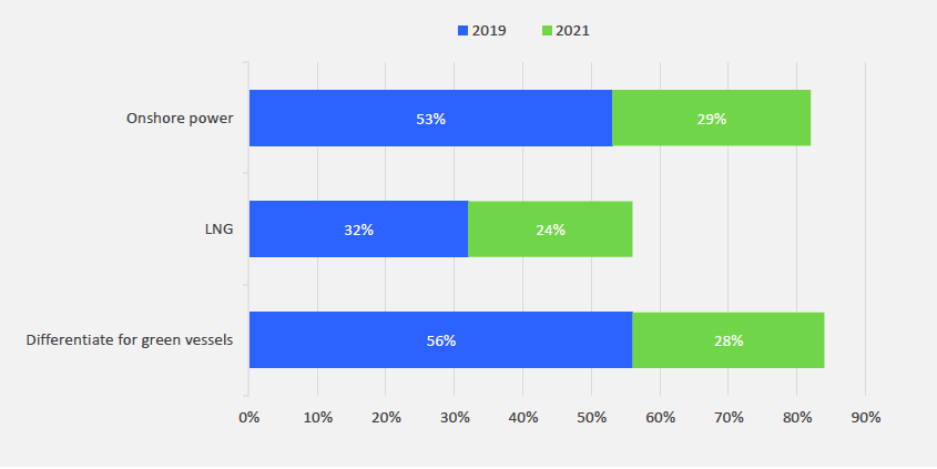Las autoridades portuarias podrían estimular y facilitar la reducción de emisiones de GEI con tarifas e impuestos específicos, suministro de energía en tierra, servicios móviles de energía para enviar y mejorar la eficiencia de las operaciones portuarias. La Figura 19 ofrece una descripción general de la situación en 2019 y los planes de las autoridades portuarias para los próximos dos años en el suministro de energía en tierra.