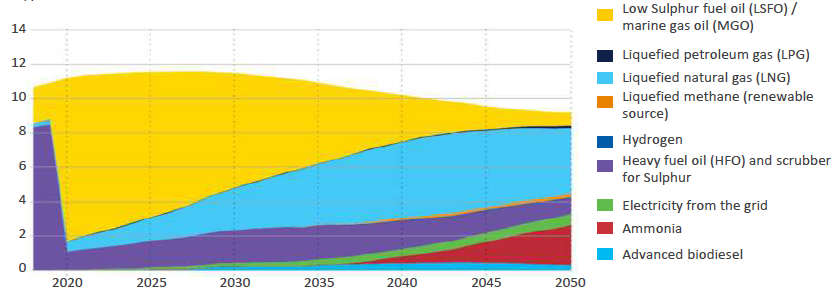 La contribución de los transportadores de GNL y GLP – Gas de petroleo licuado aumenta considerablemente y, a pesar del alto grado esperado de electrificación del transporte por carretera, el transporte de petróleo sigue siendo una parte importante del comercio marítimo total en 2050.